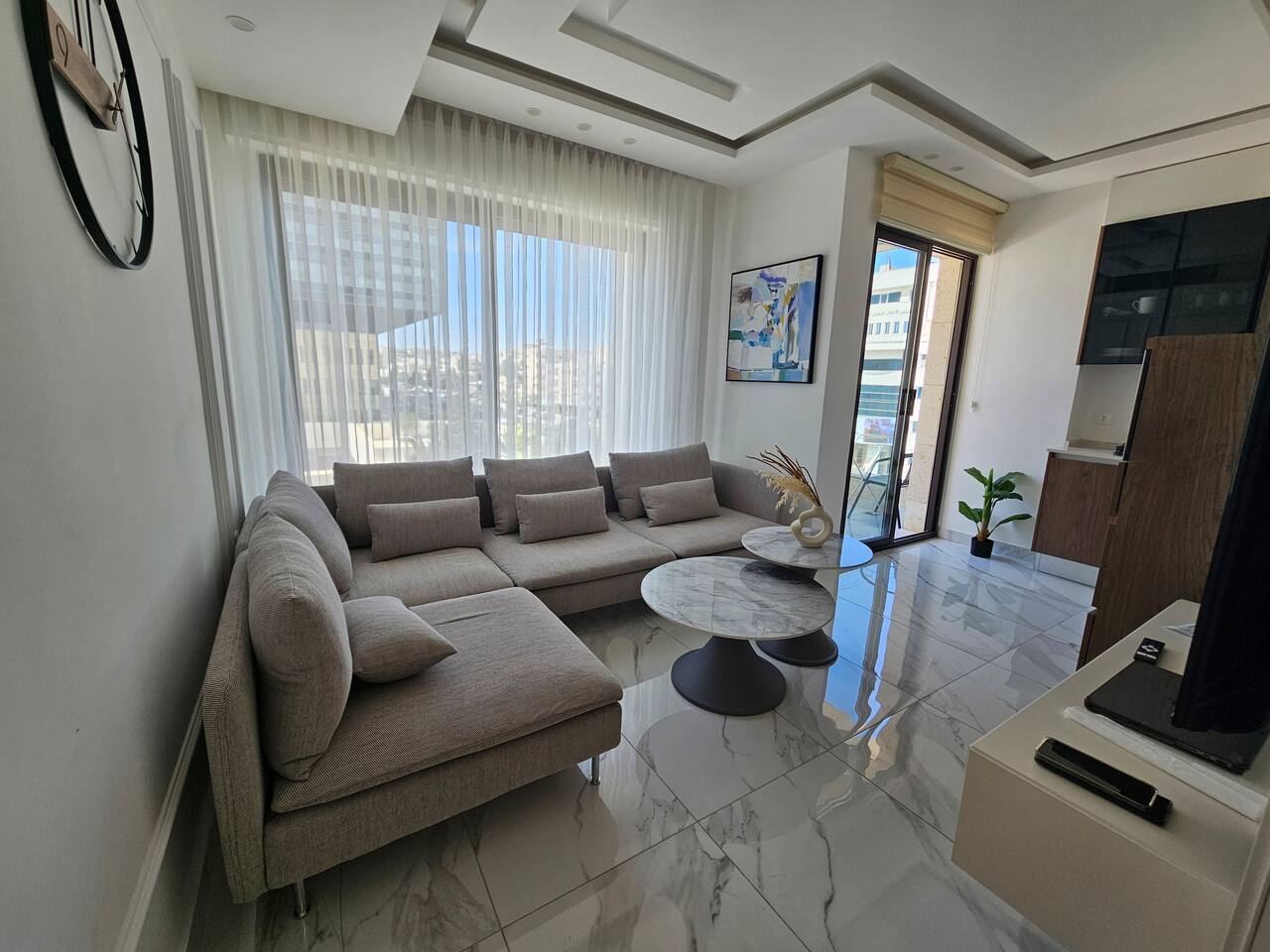 Enjoy a stylish experience at this centrally-located place. 5 min away from Abdali Mall 1 min away from Housing Bank 1 min away from Citi Bank 2 min away from Arab Bank Full kitchen Central cooling and heating High-speed internet Large-screen smart TV Large and comfortable bed Balcony (Smoking is prohibited inside. Smoking is permitted only on the balcony).